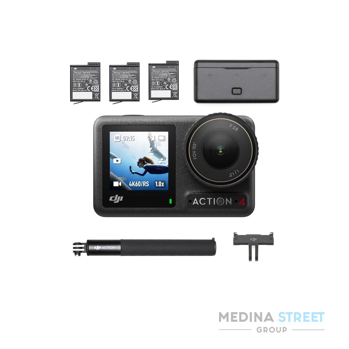 On retrouve dans ce pack : une caméra Osmo Action 4, un chargeur triple, une perche extensible de 1,5 mètre, 3 batteries et divers accessoires de fixation.